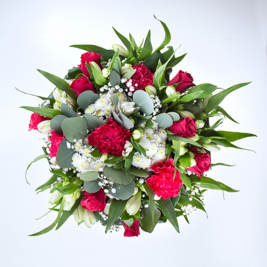 Our bouquet showcases the exquisite beauty of red roses blended with sweet white chrysanthemums and delicate gypsophila. Accented by white alstroemeria and aspidistra leaves, it presents a unique and sophisticated design perfect for any occasion.