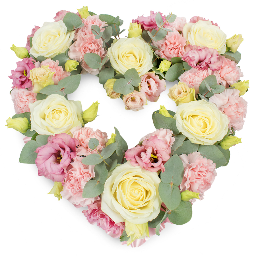 Honor your loved ones with our charming open heart flower tribute. This sophisticated bouquet features a lovely mix of white roses, pink carnations, and pink lisianthus, accented with fresh eucalyptus leaves for added elegance.